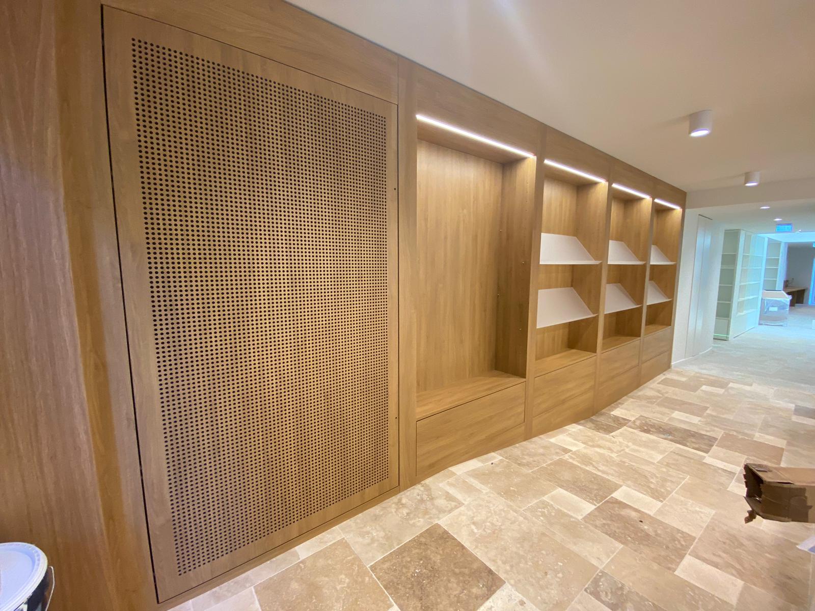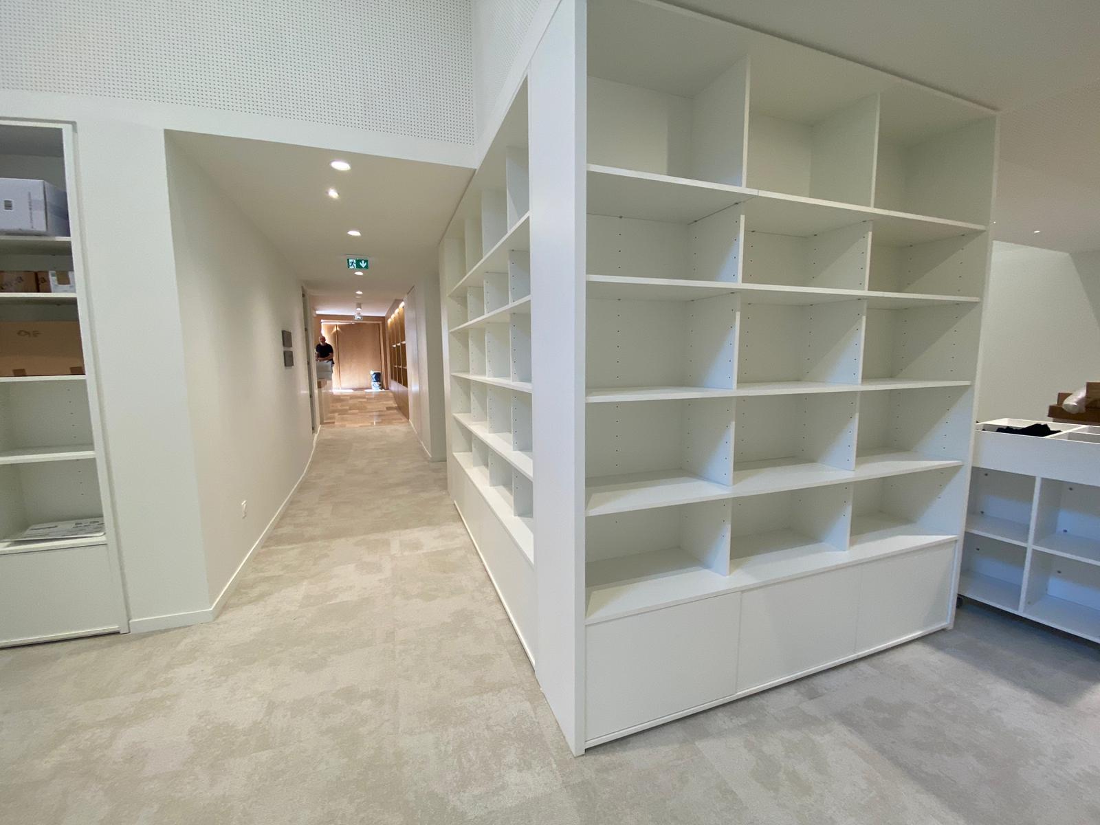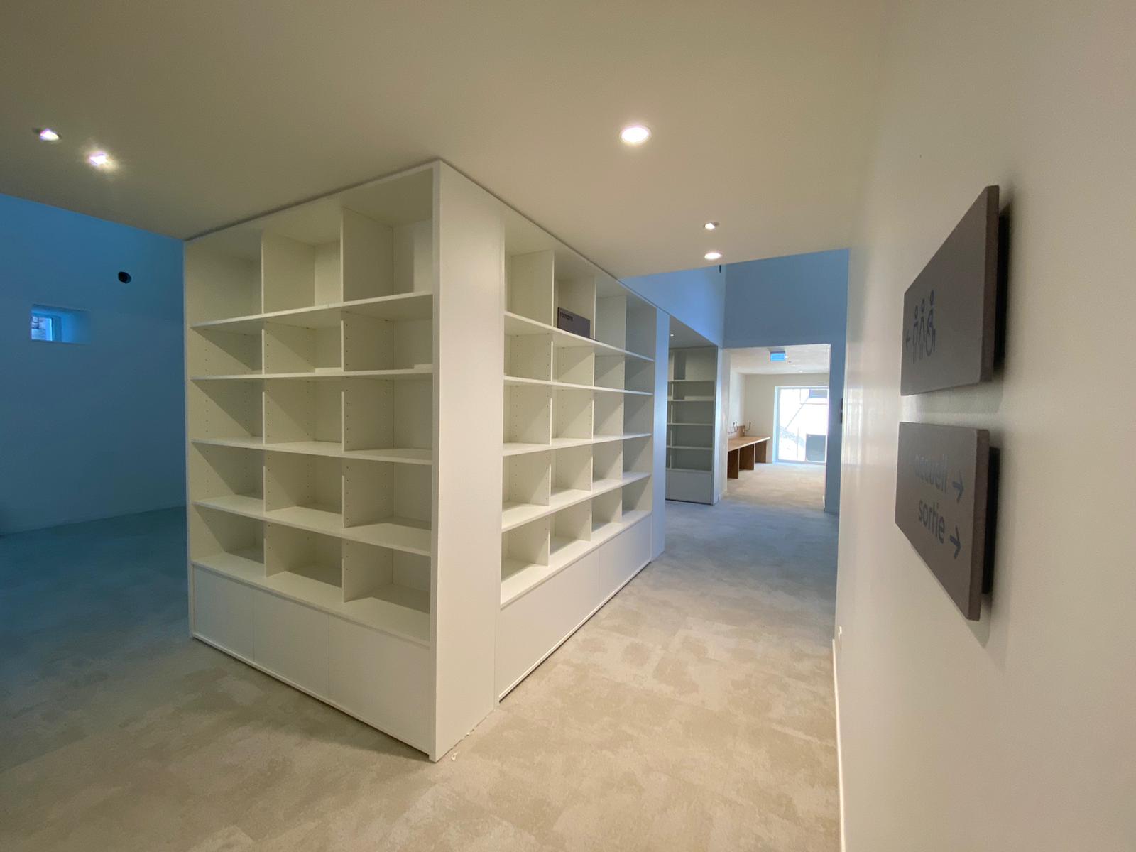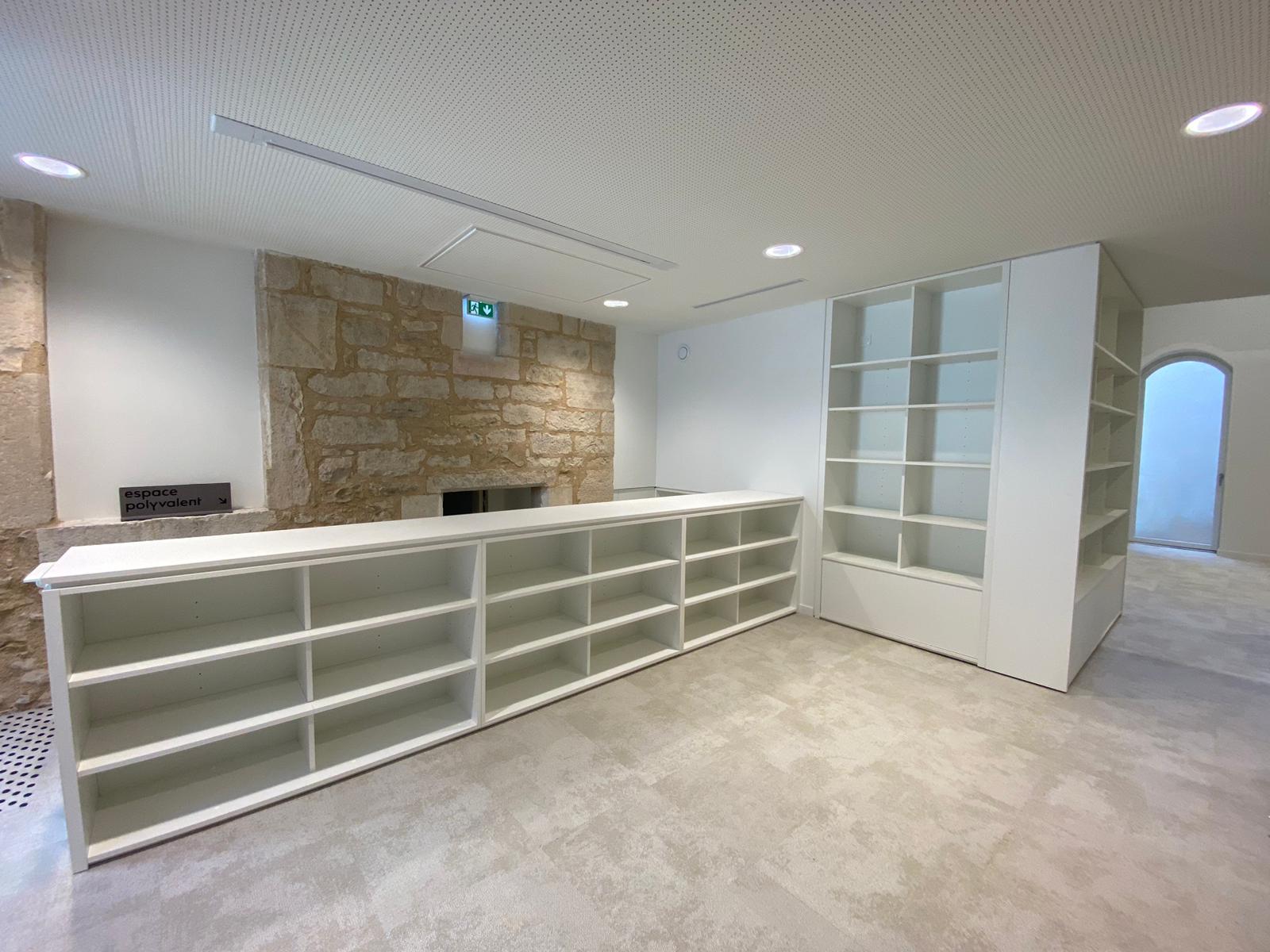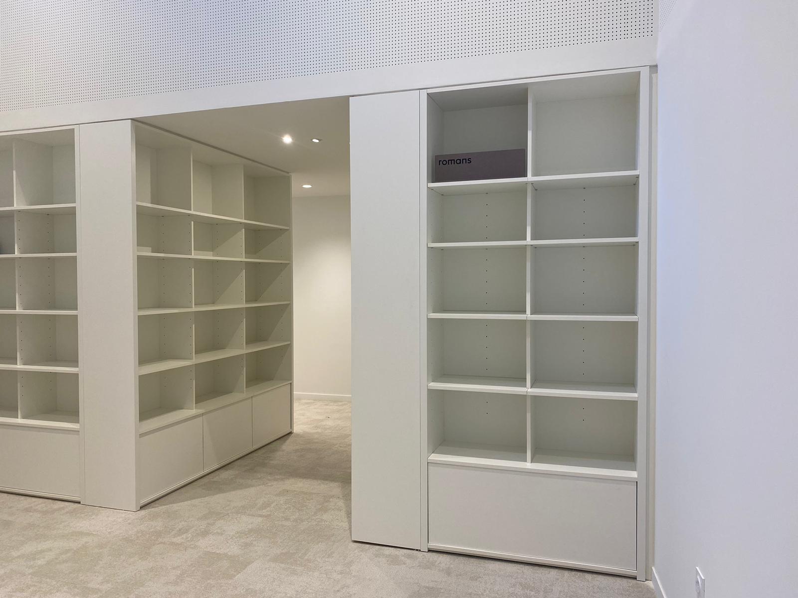 Pour répondre à cette exigence, notre atelier a réalisé un agencement sur mesure. Nous avons mis en œuvre des assemblages à coupe d'onglet avec renforts invisibles pour garantir une linéarité parfaite des rayonnages. Les zones d'assises et les banquettes intègrent des revêtements acoustiques pour favoriser le confort de lecture.